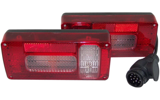5-functionele verlichtingsset, knipperlichten, remlicht, achterlicht met kentekenplaatverlichting, achteruitrijlicht en mistachterlicht, ca. 1,5 m kabel met 13-polige stekker en ca. 1 m tussenkabel, eenvoudig te monteren. Gatenafstand voor de montage van de draadstangen 15,5 cm.